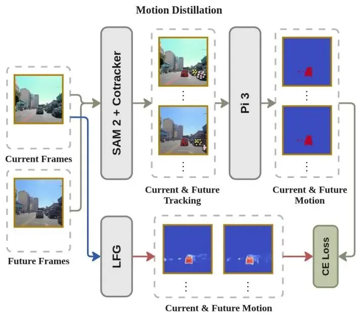 本文引入LFG – Learning to drive is a Free Gift – 一种无需标签、由教师引导的方法,用于仅从视觉中学习此类表示。本文将未来预测公式化为几何、运动和语义特征上的下一个标记预测问题。在重建聚合器之后添加了一个轻量级的自回归Transformer,使得在一个子集视图上训练的学生模型能够受益于具有完整序列访问权限的更强模型。监督来自几个专门的教师——SegFormer [31] 用于语义,SAM2 [13] 和 Co Tracker3 [10] 用于运动线索 —— 每个都以最佳利用其在未标记驾驶视频上的优势的方式使用。