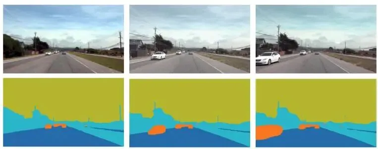 第三,本文模型预测具有7个类别的语义分割: , ,其中每个像素的独热向量 编码了语义类别(例如,道路、车辆、行人、建筑、植被、天空和背景)。这些语义预测提供了对场景的语义化、结构化的理解,本文认为这对下游任务是有用的。