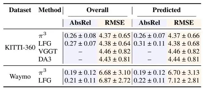 对于单目深度预测,本文在 KITTI-360 和 Waymo 开放数据集 [24] 上进行了评估,每个数据集包含 200 个序列,每个序列有 6 帧。本文在与真实深度进行尺度和位移对齐后计算均方根误差(单位为米)和绝对相对深度误差。类似于语义分割,本文使用 6 帧样本,并将所有帧提供给教师模型 ,而将前三帧提供给本文模型。本文还包括强单目基线(VGGT 和 DA3)以说明教师模型的质量;这些结果表明,在本文设置中, 仍然是最强的教师模型。