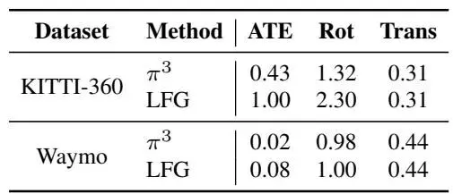 本文通过紧密遵循原始骨干网络的架构来实现本文的模型,该网络大约包含10亿个参数。总体而言,LFG包含14.5亿个参数,并且在NVIDIA RTX 5090 GPU上以的频率运行。图像编码器是从DINOv2-预训练的骨干网络初始化的,本文直接采用交替注意力模块。点、置信度和相机头部分保持冻结状态。语义和运动掩码头部分是从点头部分初始化的。本文的因果自回归Transformer由4层组成,具有8个注意力头,丢弃率为0.1。它接收来自编码器的潜在场景令牌,并自回归地预测未来的帧令牌,然后将这些令牌解码为点图、语义图、置信度图、相机姿态和运动掩码。