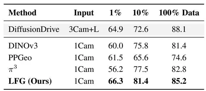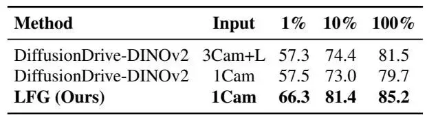 表4. NAVSIM上的数据效率比较(PDMS↑)。LFG的预训练编码器具有优越的数据效率,在低数据情况下表现出色,并在所有标签比例下优于其他预训练编码器。
