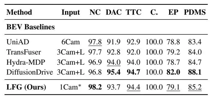 表5. NAVSIM规划基准测试:单摄像头LFG与基于BEV的基线对比。所有指标越高越好。