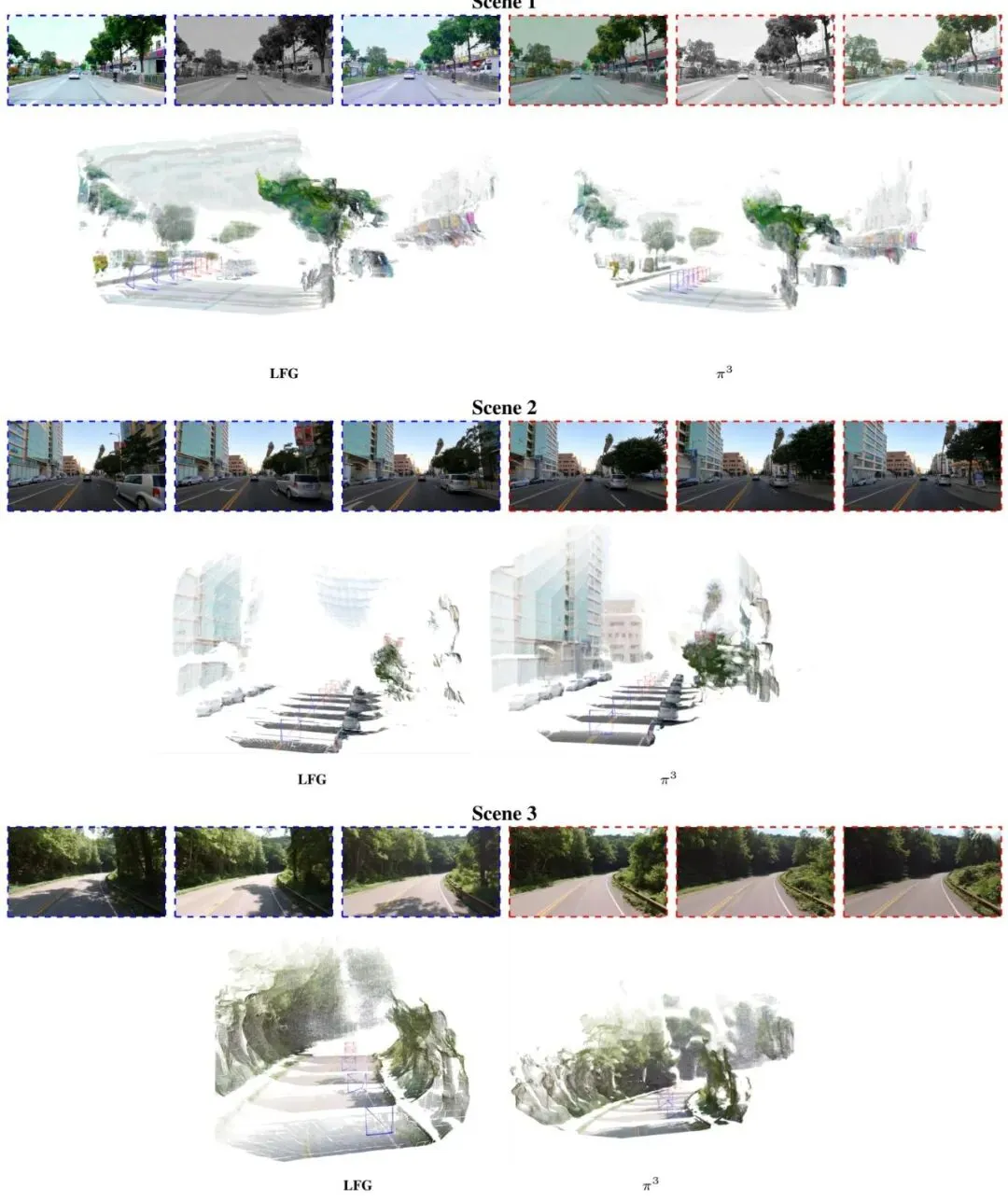图7. LFG与 的完整点云重建定性比较。当前相机姿态用蓝色表示,未来姿态用红色表示。LFG点地图即使在未来帧中也保留了整体几何质量,并且预测的相机运动仍然精确。虚线红色轮廓表示没有真值图像输入的预测帧,完全由模型的未来token生成。