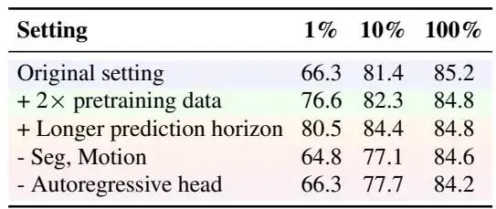 数据效率。表4评估了当训练数据量变化时,不同预训练编码器在NAVSIM规划中的迁移效果。在预训练编码器中,LFG在所有标签比例下始终实现了最佳的PDMS:在标签的情况下,LFG达到了81.4 PDMS,与DINOv3的全数据性能相匹配,这突显了本文在真实视频上的预训练的有效性。本文将这些提升归因于编码器对场景更强的时间理解能力,使其能够更好地利用短时间的过去帧序列进行规划。它超越了其教师模型之一和PPGeo [30],展示了即使强大的前馈架构也需要对未来语义和时间的理解。更多消融实验见补充材料。消融实验。表7显示,在低标签情况下,扩展预训练数据和延长预测时间范围都能提高PDMS,而移除分割/运动监督或自回归头会降低性能,证实了这些组件的重要性。
