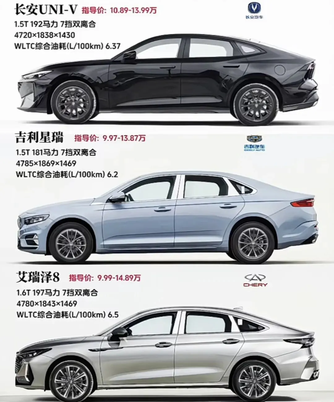 从指导价来看,星瑞的门槛最低,9.97万就能入手;艾瑞泽8是9.99万,几乎一样;而UNI-V要10.89万起,稍微贵一点。