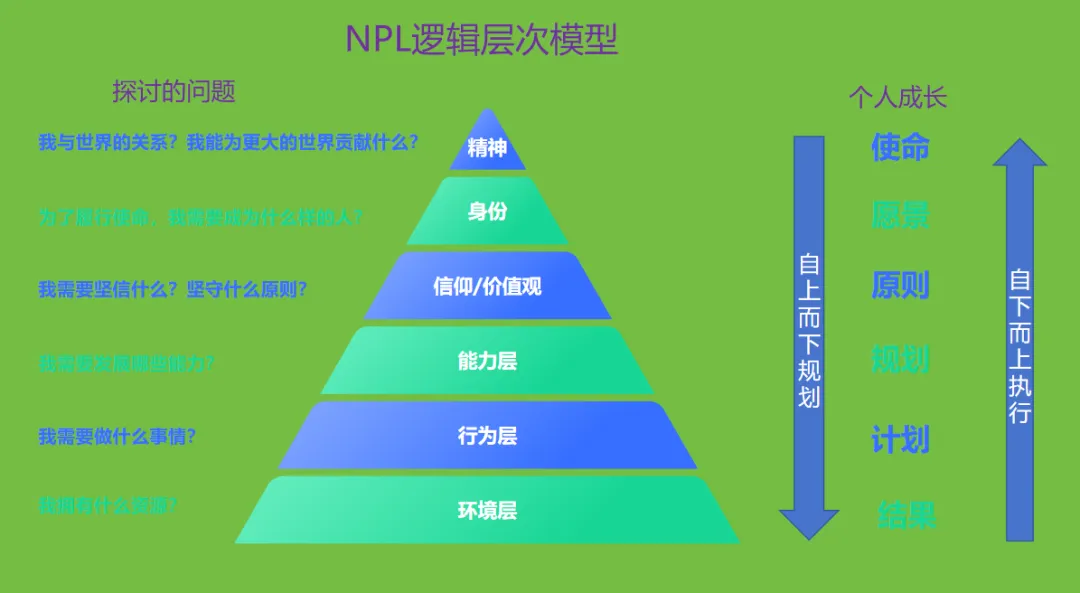 NLP模型告诉我们,人的思维与行为分为六个层次,如同一个金字塔: