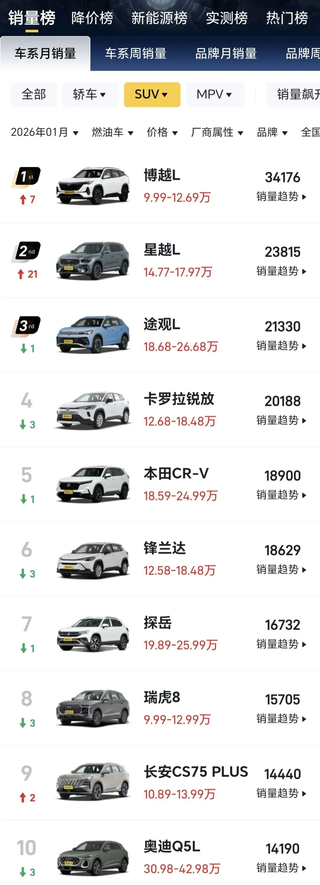 1月份的SUV销量榜单,越看越有味道。