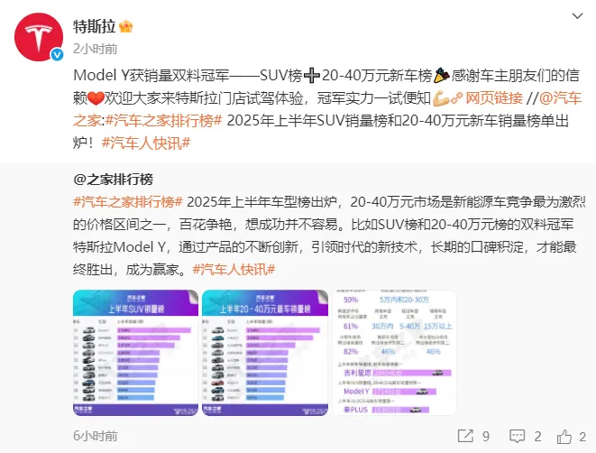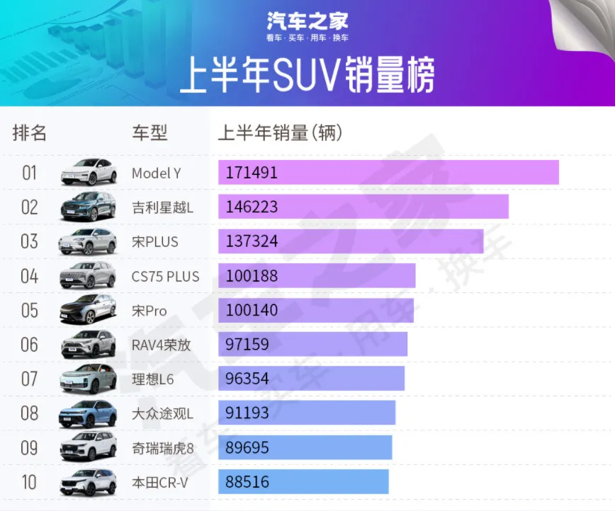 近日,汽车之家发布了2025年上半年SUV中国销量排行榜,备受瞩目的TOP10车型新鲜出炉。其中,特斯拉Model Y凭借171491辆的傲人成绩,毫无悬念地摘得桂冠。