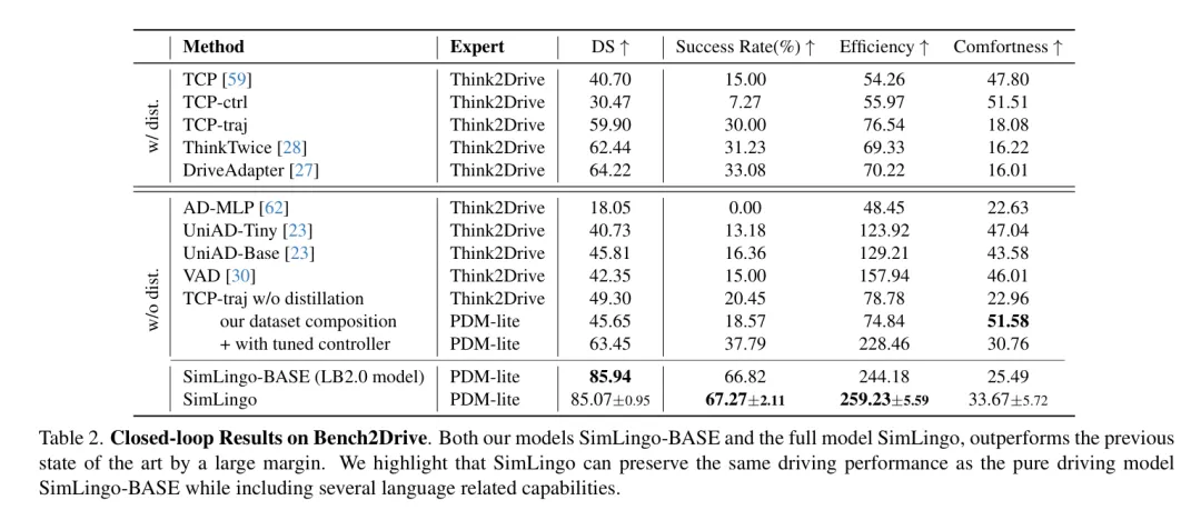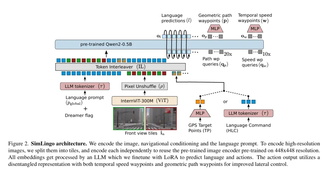 同时,SimLingo采用LoRA(Low-Rank Adaptation)方式对Qwen2-0.5B进行轻量化微调,仅更新注意力层(Attention Layers)权重,冻结其他预训练权重。让LLM学会处理 “视觉 Token + 语言Token” 的交织序列,从而在语言输出层面,能够回答VQA问题、生成驾驶决策解释;在动作输出层面,通过路径路点(Path waypoints)和速度路点(Speed waypoints)预测驾驶动作。至少是我目前能看到的比较小的代价,性价比蛮高的!直接预测自然语言结果(o_l),支撑VQA、决策解释等任务;- 几何路径路点(