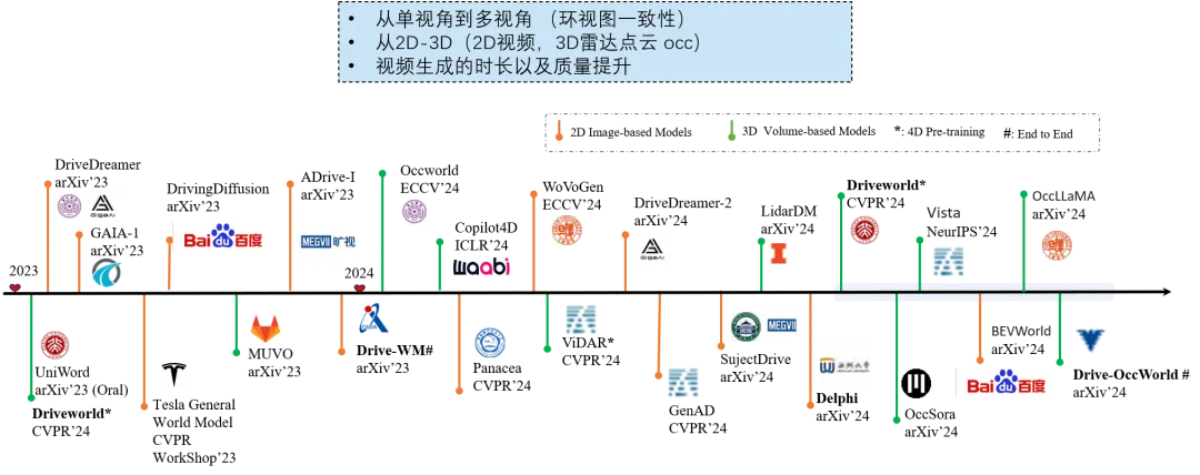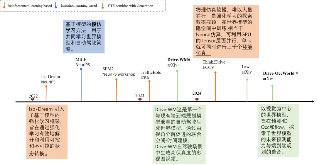 一句话总结就是:世界模型 = 时空知识 + 预测未来 +表征能力。世界模型的技术演进非常快,相关的论文也是非常之多,在自动驾驶领域,旨在降低驾驶不确定性的世界模型主要分为两类:作为神经驾驶模拟器的世界模型,以及用于端到端驾驶的世界模型。核心还是在虚拟世界能够进行准确的模拟,预测未来,再通过端到端统一的时空建模,让决策更流畅、更接近人类驾驶员的直觉。本小节图片来源https://openvisuallab.github.io/archiver/worldmodel/