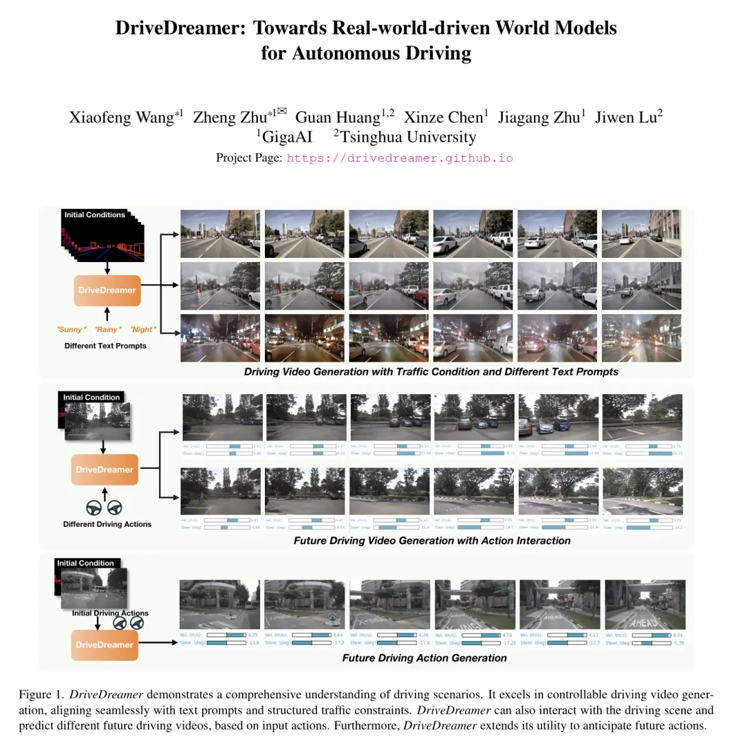 由于之前提到,相关论文非常多,我们找了一篇ECCV 2024的顶会论文“DriveDreamer: Towards Real-world-driven World Models for Autonomous Driving”。该研究由GigaAI与清华大学联合完成,是首个完全基于真实世界数据构建的自动驾驶世界模型,解决了传统世界模型多依赖仿真环境、脱离现实的核心痛点。需要说明的是这还是一个2D视频生成模型,该工作后续衍生出了DriveDreamer4D(CVPR 2025),将2D视频生成升级为4D场景重建,进一步推动了自动驾驶闭环仿真的发展。对于自动驾驶领域,这种技术使得在虚拟世界中,模拟“极端危险、长尾的”真实场景成为可能,大幅降低了实车路测的成本与风险。https://arxiv.org/pdf/2309.09777