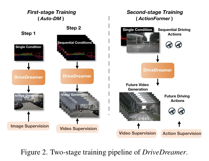 DriveDreamer是该论文的核心,不像之前聚焦于游戏或者模拟器的世界模型,DriveDreamer是首个完全基于真实世界驾驶场景构建的开创性世界模型。考虑到在复杂的驾驶场景中进行世界建模涉及巨大的搜索空间,DriveDreamer利用强大的扩散模型来构建对复杂环境的全面表征,即自动驾驶扩散模型(Auto-DM:Diffusion MoDEL)。关于扩散模型,可以看我之前的文章从Diffusion到DiT,一文讲清楚扩散模型。扩散模型本质上是一类概率生成模型,其核心原理是先向数据中逐步引入噪声,然后学习逆转这一过程以生成样本。从噪声中生成图片,和从噪声中生成视频的原理其实都是类似的,这个技术有点反直觉,打个比方,就好像语言模型生成的句子是概率最大化的,那扩散模型就是生成的图片或者视频也是所有候选中概率最大的。此外,DriveDreamer引入了一种两阶段训练流程。在初始阶段,DriveDreamer深入学习结构化交通约束;在后续阶段,模型被赋予预测未来状态的能力。同时,DriveDreamer将其预测能力扩展到预测未来的驾驶策略,其预测过程基于历史观测数据和Auto-DM提取的特征。从而创造出一个可执行、可控且可预测的驾驶世界模型。- 解耦训练的巧思两阶段训练是 DriveDreame 的核心创新:先让Auto-DM “学规矩”(交通结构),再让ActionFormer “学交互”(动作与场景的联动),完美解决了传统世界模型 “一口吃不成胖子” 的训练难题。