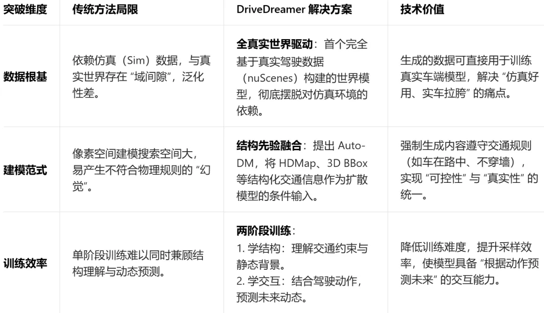 - 对比视频扩散模型:DriveDreamer加入了自动驾驶专属的结构化交通约束,避免生成 “车辆穿墙、逆行” 等不合理内容;