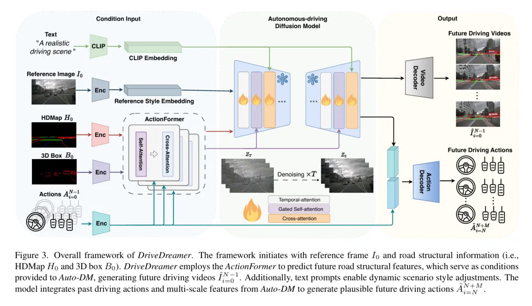 - 多模态的深度融合区别于传统驾驶生成模型,DriveDreamer同时支持结构化输入(HDMap、3D框等)、文本输入(天气、时段控制)、动作输入(驾驶决策),实现了 “所见即所得、所控即所生” 的精准可控性。