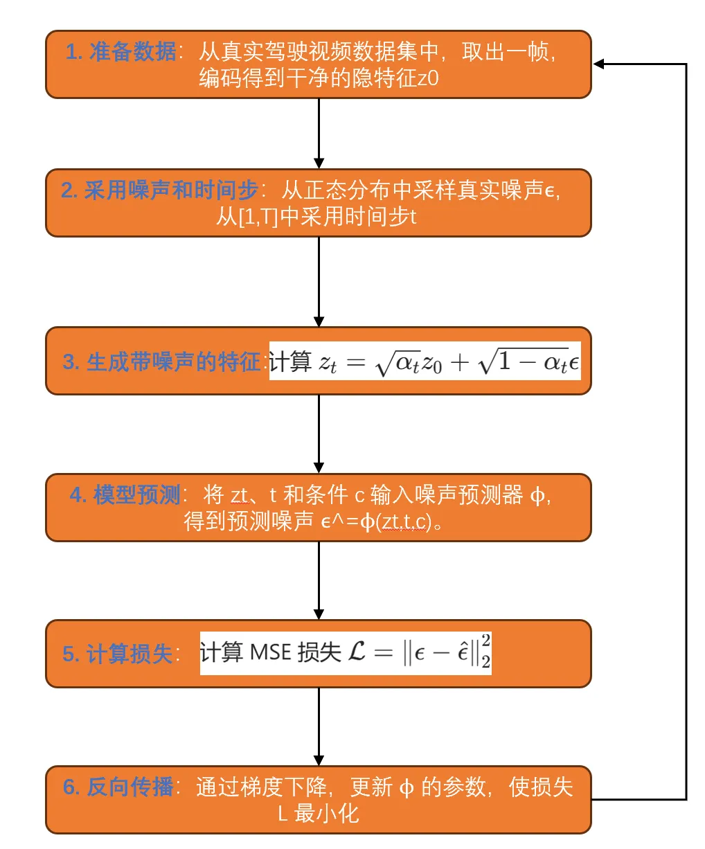 右侧:Auto-DM(自动驾驶扩散模型),这是世界模型的核心,生成未来驾驶视频。对应世界模型(图7)里面的World Model,负责预测未来。- 去噪过程(Denoising ×T)采用时空注意力(Temporal-attention)、门控自注意力(Gated Self-attention)和交叉注意力(Cross-attention),将噪声隐变量zt逐步去噪,生成未来帧的隐表示。