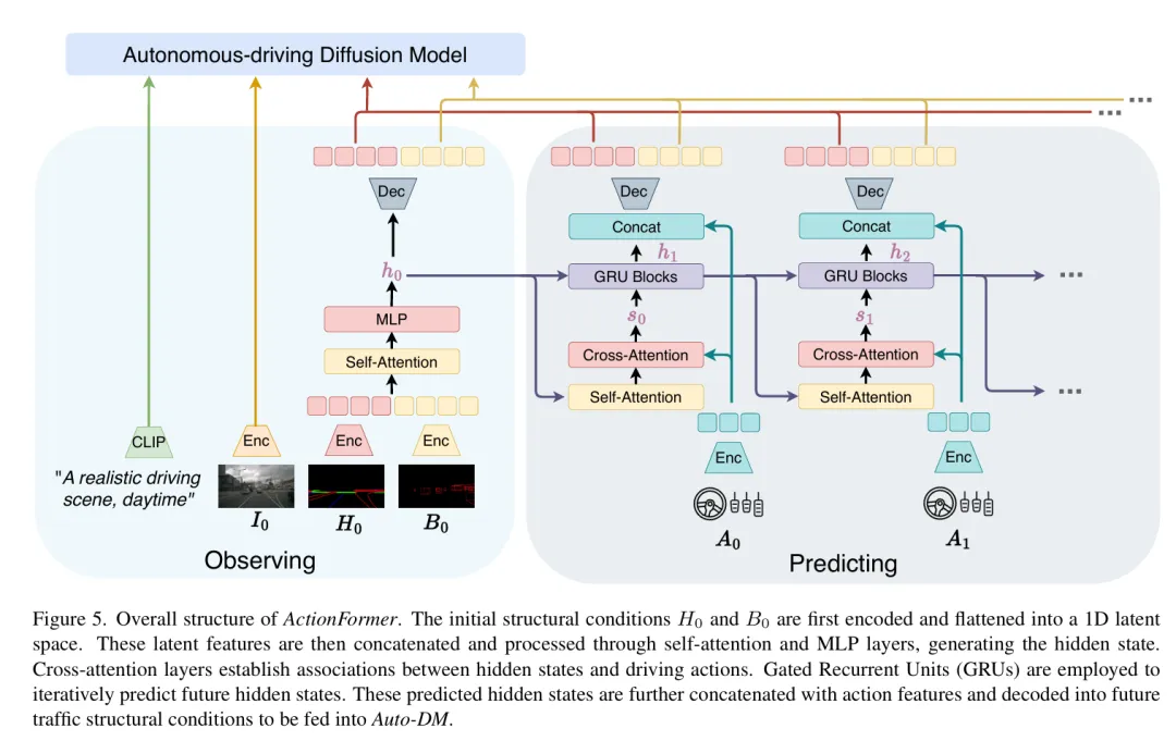 在ActionFromer里面,Cross-Attention交叉注意力用于建立隐藏状态Hidden states和驾驶动作之间的关联,然后送给门控循环单元(GRUs)来处理,通过GRU不断地预测未来的隐藏状态Hidden states。这些预测出的隐藏状态会进一步与动作特征拼接,并被解码为未来的交通结构条件,最终输入至 Auto-DM 中。