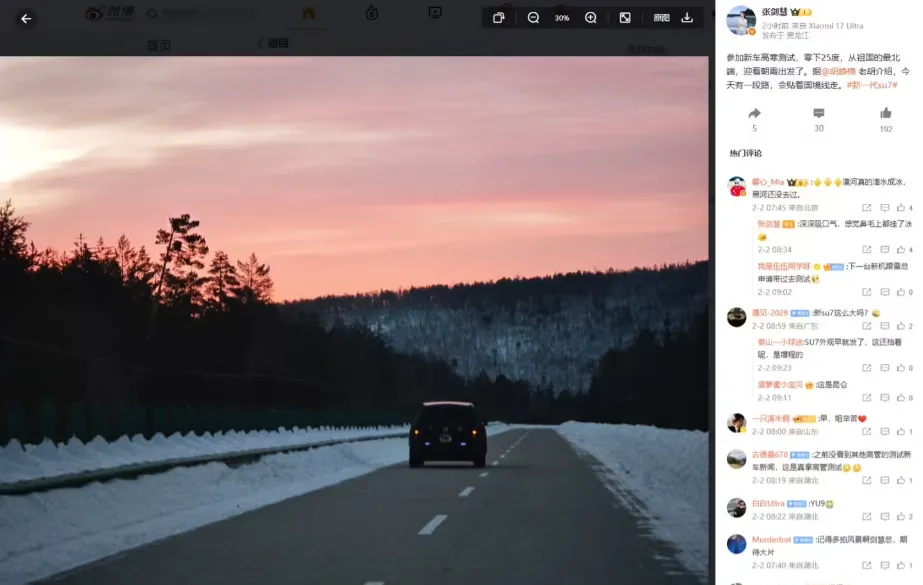 值得注意的是,小米集团副总裁张剑慧等高管近期也通过社交媒体间接透露了新车进展,展示了车辆动态测试中的状态,侧面印证了项目正在稳步推进。