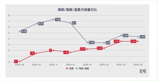 让比亚迪有痛感的典型就是海鸥和海豚,这俩一直是销量扛把子和基本盘,结果去年底上市的吉利星愿一路把它们打得节节败退。只比海鸥贵4000块就能买到海豚的尺寸,配置还比海鸥多,买菜车用户选星愿基本不用犹豫,4月份星愿一款车的销量都快赶上海鸥海豚加起来了。