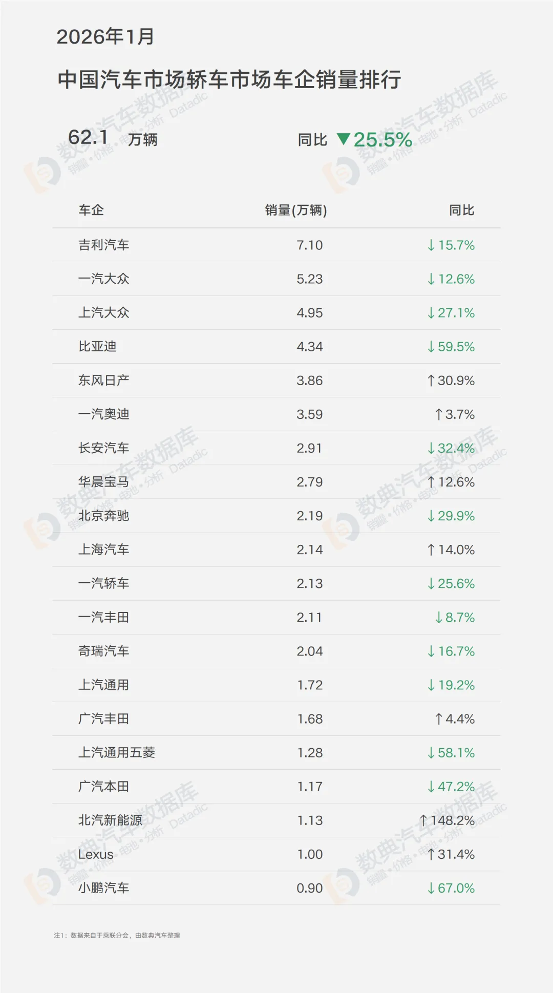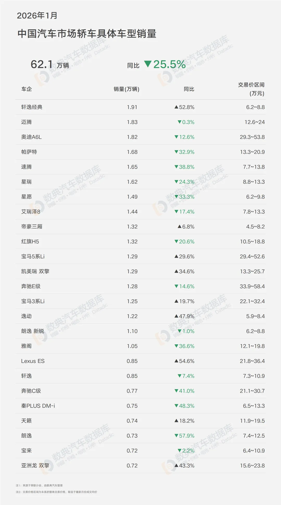 2026年1月,中国汽车市场整体销量156.3万辆,同比下降15.1%。其中,轿车市场销量62.1万辆,同比大幅下滑25.5%,跑输大盘近10个百分点,成为开年最受冲击的细分市场。