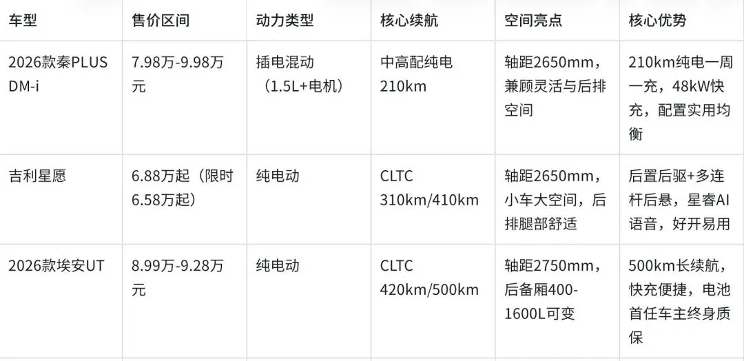 2026年10万级家用车已实现空间、经济与智能的全面平衡,四款车型各有侧重,按需选择即可。想要通勤+长途无焦虑,秦PLUS DM-i拥有210km纯电+插混,用车成本低、配置实用;预算有限、主打城市代步,选吉利星愿,后驱+多连杆,续航灵活、好开好停;追求纯电长续航与大空间,选埃安UT,500km续航+电池终身质保,家用省心。