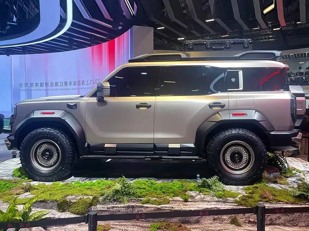 侧面看着尺寸很大,预计车长将会超过5米,与此同时,车辆的D柱也采用了这种隐藏式的设计,再搭配上车尾的外挂式备胎,整个视觉观感看着还是挺气派的。