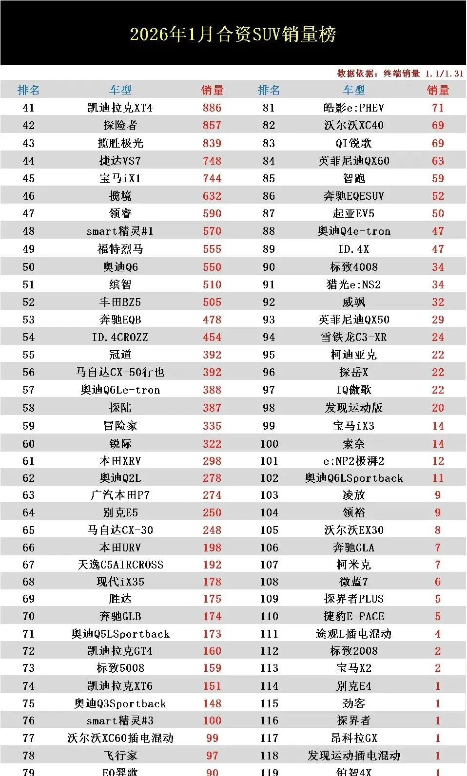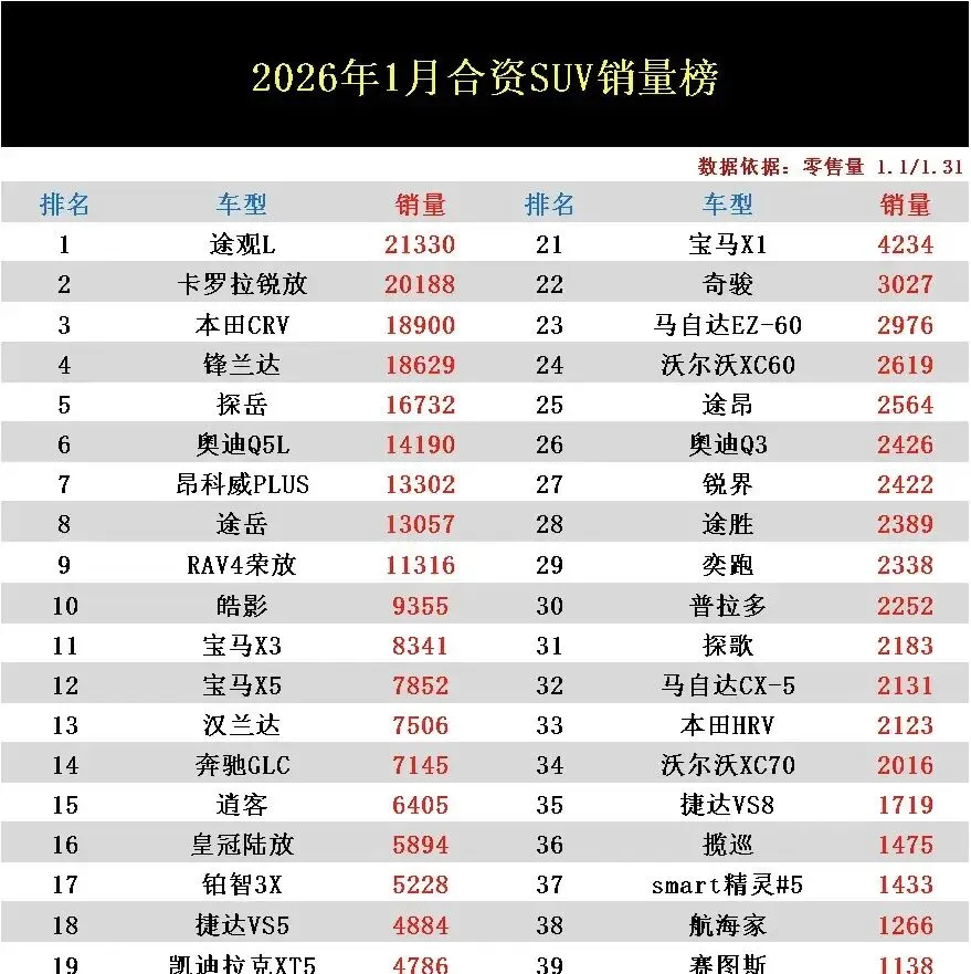 导读:看完乘联会最新公布的1月合资SUV零售量排行榜,感觉这一细分市场的销量较前几年冷清了许多,在上榜的众多车型当中只剩下9款销量超过万辆,自第40名以后各车型月销量更是迅速下降至千辆以下,最让人唏嘘的是,榜单尾部第77名以后高达40多款车型月销量竟然不足百辆,整体表现让人心酸。其中大众途观L以21330辆的成绩拿下榜单头名,丰田卡罗拉锐,本田CRV、锋兰达等日系主流车型携手紧随其后,别克昂科威PLUS销量13302辆,排在第7,是榜单前十中唯一不属于德系与日系品牌的车型。整体来看,随着国产车的崛起,合资SUV市场的销量彻底分化,资源正在往头部车型集中,整个市场只有德系与日系品牌车型在苦苦支撑,其它品牌车型则几乎全线溃败,合资SUV市场正在经历严峻挑战。太惨了!1月合资SUV销量排名:仅9款破万,途观L夺冠,汉兰达第13