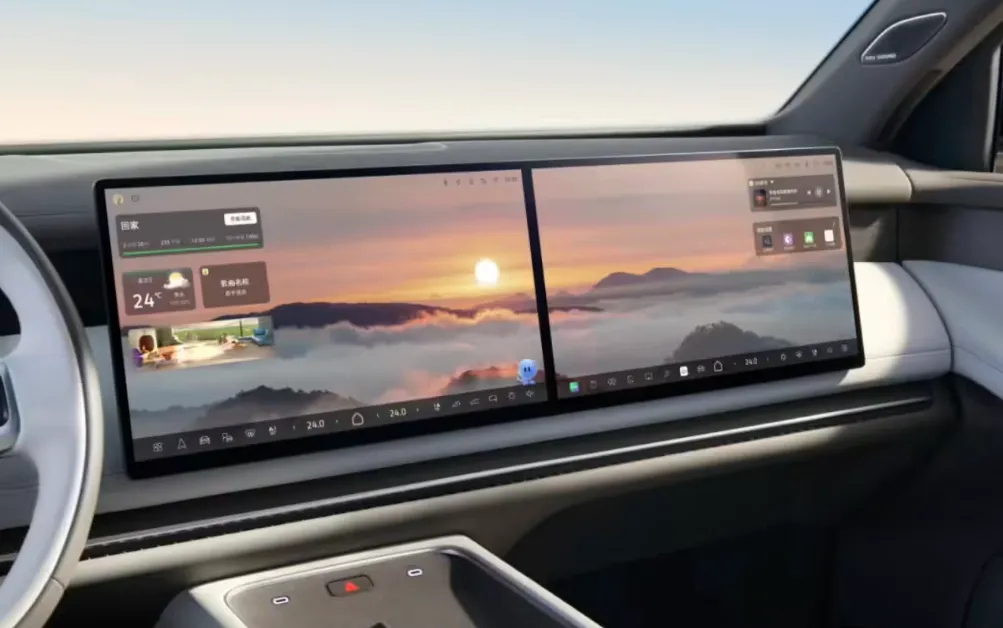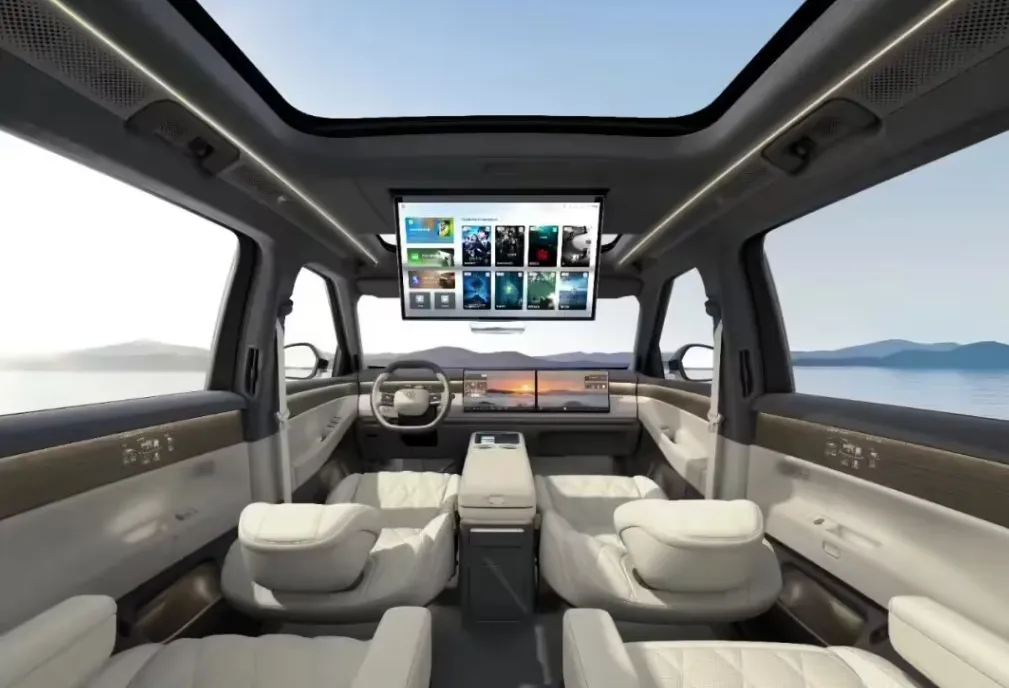 屏幕配置,前排直接怼上了 15.6 英寸的超高清主副驾双联屏,后排更顶,给了一块 21.4 英寸的可折叠吸顶大屏,最细节的是这块吸顶屏还贴了一层视角补偿膜,保证第三排乘客看片的时候不反光,不偏色。