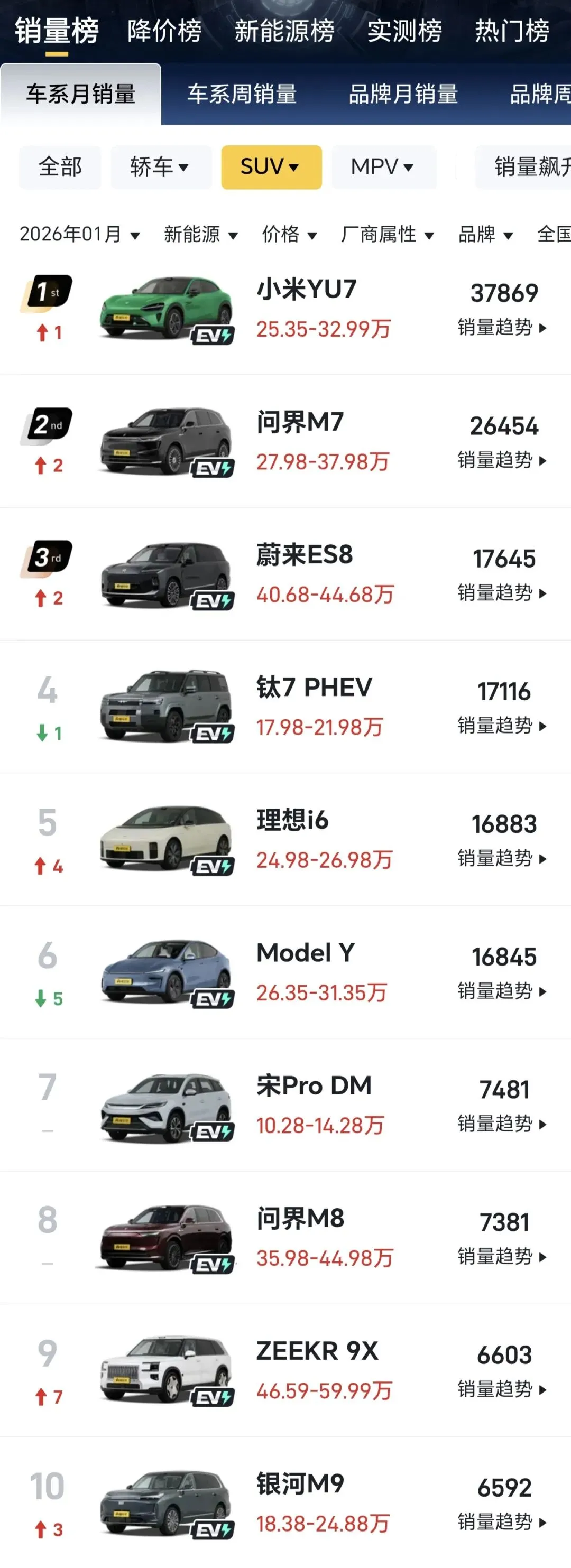 表现较好的小米YU7以37869台的成绩直接把Model Y拉下马,问界M7紧随其后卖了26454台,蔚来ES8也冲到了17645台。