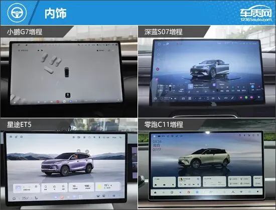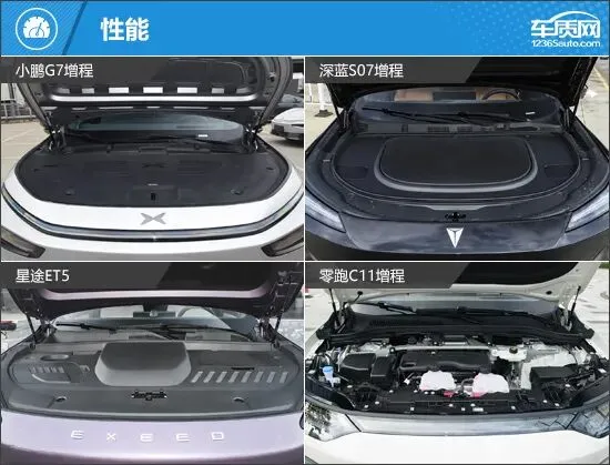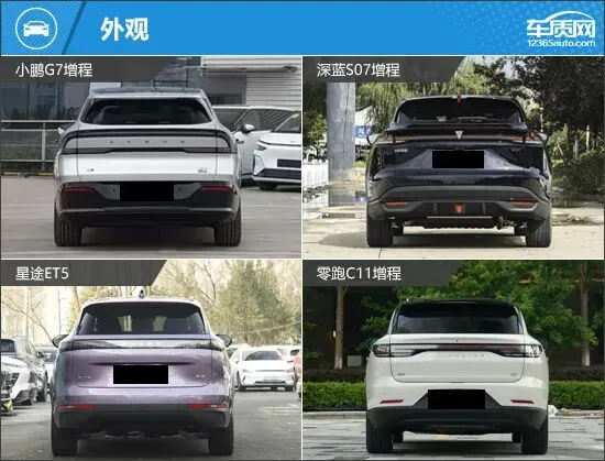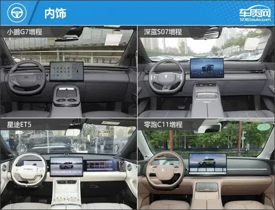外观方面,四款车型均具备新能源车的造型特点,但风格却各有不同。小鹏G7增程采用星环贯穿灯带,搭配辨识度超高的尾灯,充满未来感和科技范。深蓝S07增程是四款车中线条最为锋利的车型,狭长的头灯、上扬的腰线与巨大的车顶扰流板,营造出极致的运动格调。星途ET5和零跑C11增程造型圆润饱满,视觉上给人一种敦实大气的效果,前者更强调豪华氛围,后者低调耐看,有种简约之美。