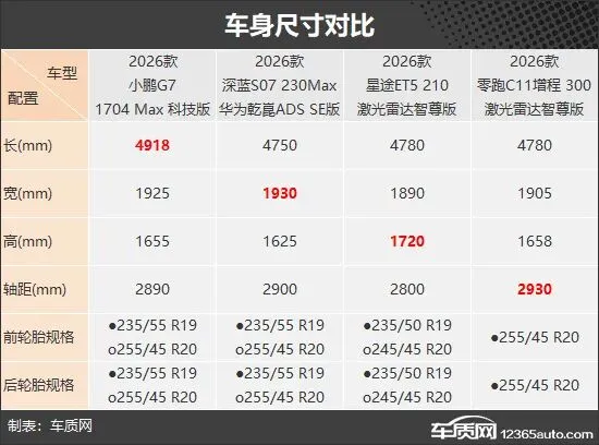 车身尺寸部分,四款车型各具优势,小鹏G7增程的车长最长,深蓝S07增程的车宽最宽,星途ET5的车高最高,轴距最长的则是零跑C11增程。轮毂尺寸上,零跑C11增程标配20英寸轮毂,其余车型均标配19英寸轮毂并支持选装20英寸轮毂。