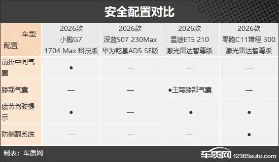 安全配置方面,我们从主/被动安全两方面进行分析。被动安全上,小鹏G7增程独享前排中间气囊、星途ET5独享主驾膝部气囊;另外两款车表现均乏善可陈。主动安全上,零跑C11增程扳回一城,同时具备疲劳驾驶提示和防侧翻系统;相比之下,深蓝S07增程的主动安全配置有明显缺失。