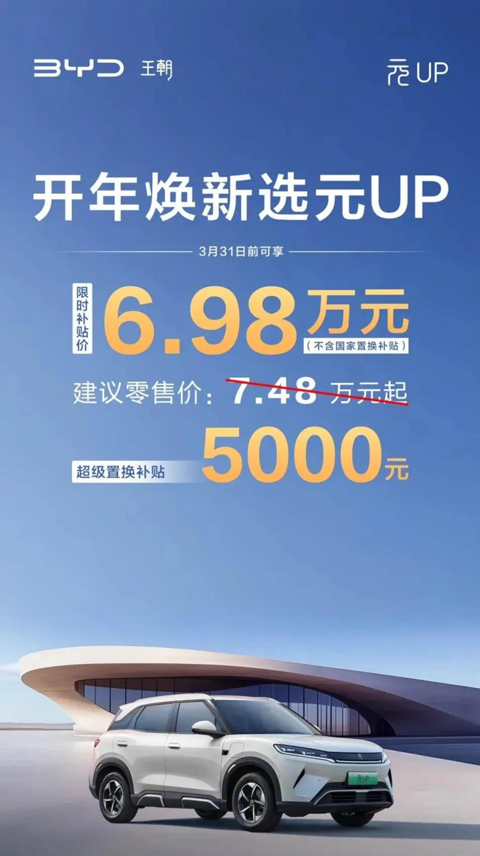 老铁们,这两天我微信快被刚工作的小年轻和接娃的宝妈们给轰炸了,全都在问同一个事儿:“老王,听说比亚迪元UP现在6万多就能拿下,是不是真的?这车能买吗?”说来也巧,昨天我刚陪一个刚摇上号的小老弟去店里转了一圈,销售拍着胸脯说:“哥,现在下手真合适,3月31号之前,置换补贴一算,6万9千8起就能开走!” 说实话,这个价格一出来,我当时心里就咯噔一下:这哪是卖车,简直是给刚需族发福利啊!