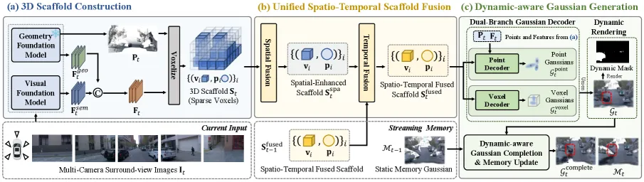 UniSplat的核心洞察在于:构建一个统一的3D潜在支架(3D latent scaffold),作为时空信息的融合中心。 这个支架就像一个全局的3D画布,它首先利用预训练模型从多视角图像中提取几何和语义先验,形成一个初始的场景理解骨架。随后,一个新颖的融合机制在这个支架内部直接整合空间(多视角)和时间(多帧)信息。最后,一个双分支解码器通过"点锚定优化"和"体素化生成"相结合的方式,生成动态感知的高斯点云,同时维护一个静态高斯点的持久化记忆,以流式补全场景。这种设计巧妙地解决了动态与静态、当前与历史信息的统一建模问题。