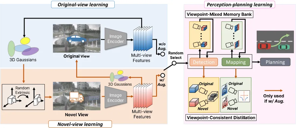 VR-Drive的解决方案极具启发性:将3D场景重建作为辅助任务,在E2E-AD框架内部联合学习,从而赋予模型"脑补"新视角的能力。 它不再需要额外的标注数据,而是利用3DGS模块从原始视角重建出三维场景,然后从这个三维场景中渲染出任意新视角的图像,用于数据增强。为了解决合成图像与真实图像之间的域差异,VR-Drive设计了"视角混合记忆库"和"视角一致性蒸馏"策略,确保规划模块能从合成数据中学到鲁棒的驾驶知识。
