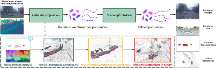 IDSplat提出了一种优雅的自监督解决方案:将动态物体建模为具有可学习刚性变换的连贯实例,而不是一堆非结构化的时变基元。 它首先利用一个零样本的语言-视觉视频跟踪器(如Grounded-SAM-2)在2D图像上生成实例掩码,然后结合LiDAR数据将这些掩码提升到3D。通过DINOv3特征匹配和RANSAC算法估计物体位姿,并利用"协调转弯"运动模型进行平滑。最后,联合优化物体轨迹和高斯参数,实现对整个场景的实例级分解重建。