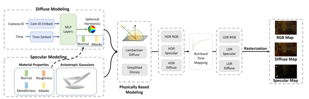 这篇工作创造性地将基于物理的渲染(PBR)思想引入3DGS框架,以应对夜间驾驶场景的挑战。其核心是将场景光照分解为漫反射和镜面反射两个分量。利用球谐函数(SH)和各向异性球形高斯(ASGs)分别对全局光照和每个高斯基元的镜面反射进行建模,并引入双向反射分布函数(BRDF)作为物理约束。这种设计使得模型能够更真实地还原夜间场景的复杂光照效果。
