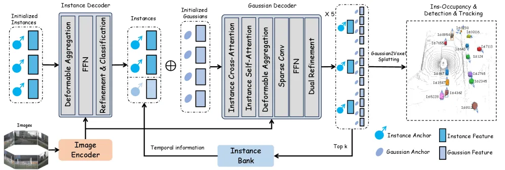 这个统一框架能够在一个端到端模型中同时完成实例级的占据预测、3D检测和跟踪。它首先通过实例解码器识别出物体,然后为每个物体分配一组3D高斯基元。这种稀疏表示极大地提高了效率,并通过一种名为"高斯到体素溅射"的技术生成精细的实例级占据图。此外,一个实例库(instance bank)被用来维持时序一致性,实现鲁棒的跨帧跟踪。