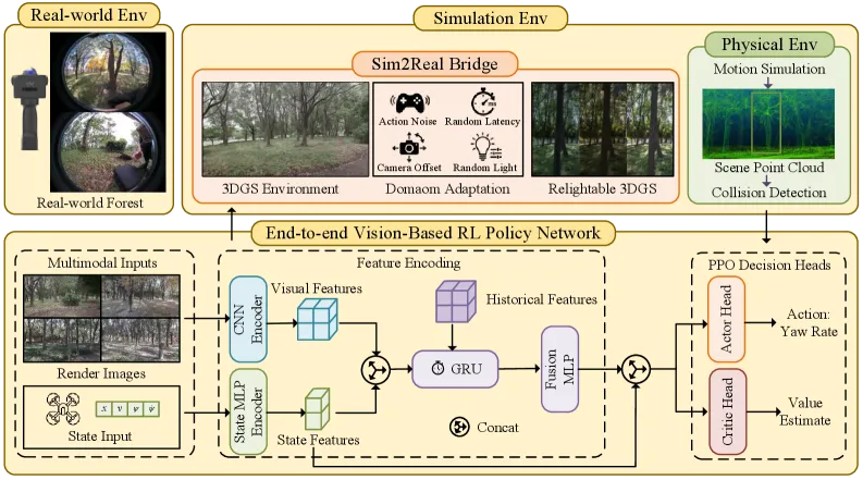 它不再像传统3DGS那样将静态光照与场景几何耦合在一起,而是将场景分解为多个物理上有意义的分量,从而允许在神经表示中对环境光照进行显式、符合物理规律的编辑。研究团队利用这种技术,从真实世界数据构建了一个高保真的仿真器,并在其中通过合成各种动态光照条件来训练一个端到端的强化学习策略。这个策略学会了光照不变的视觉特征,能够将原始单目图像直接映射到无人机的连续控制指令。
