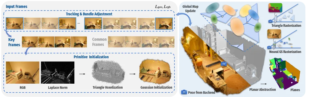 它将场景的几何与外观彻底解耦:用可学习的三角面片(triangle primitives)来显式地建模几何结构,同时用锚定在这些三角面片上的神经高斯来渲染外观。 这种设计一举两得:三角面片提供了稳定、紧凑且易于编辑的几何骨架,而神经高斯则保证了高质量的渲染效果。整个框架包含相机跟踪前端、全局位姿优化后端和场景建图器,能够高效地处理流式输入。实验证明,PLANING在ScanNetV2数据集上的重建速度不到100秒,比2DGS快5倍以上,同时几何精度(Chamfer-L2)比PGSR提升了18.52%。