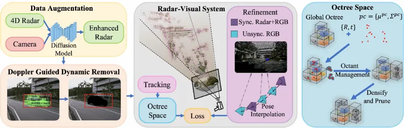 这相当于为SLAM系统配备了一个强大的"动态滤镜"。系统首先增强稀疏的雷达点云,然后利用多普勒数据生成图像中的动态物体掩码,从而为SLAM后端提供一个纯净的、无动态干扰的输入。为了处理大尺度场景,Rad-GS还引入了全局八叉树结构来高效管理高斯基元,实现了内存友好的大规模建图。