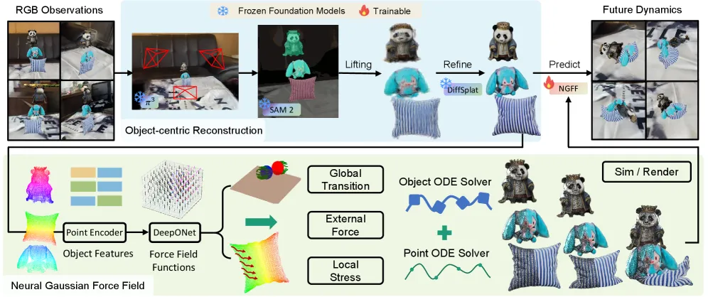 主要内容: 当前的视频生成模型生成的动态过程往往不符合物理规律 ,而传统的物理仿真器又计算昂贵。NGFF(神经高斯力场)框架首次将两者完美结合。其核心思想是:直接从场景的3D高斯表示中,学习一个显式的神经力场(neural force field)。