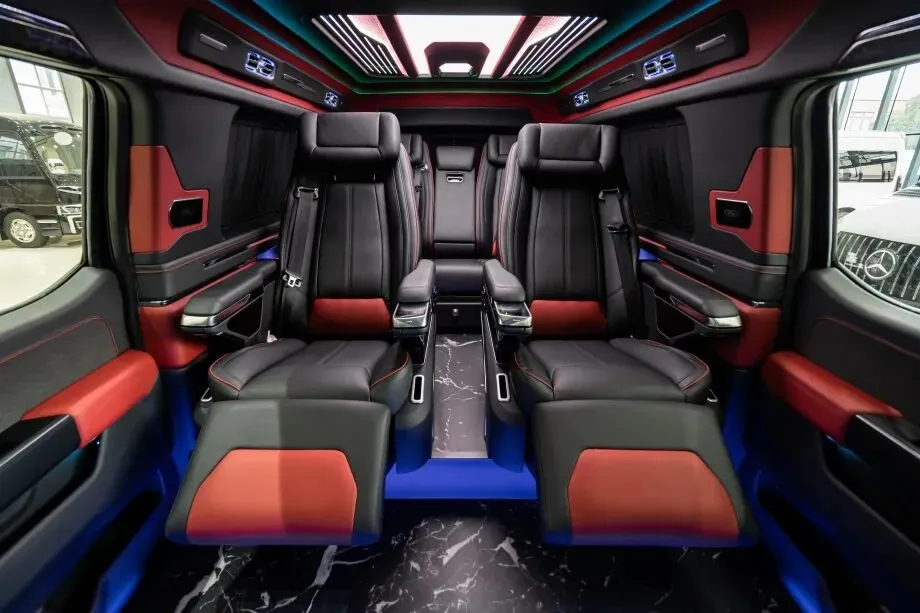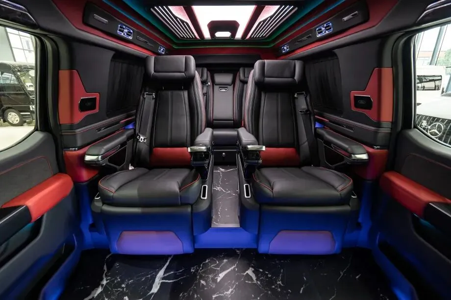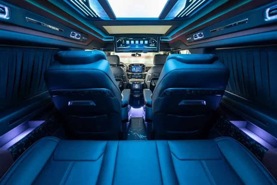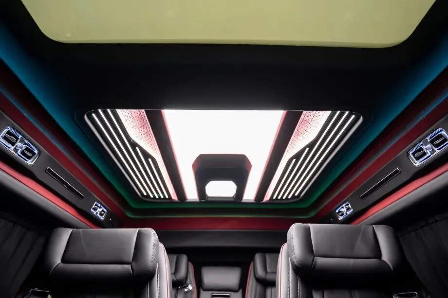 吸顶电视悬挂于车顶中央,15.6 英寸 4K 超清屏幕支持无线投屏、蓝牙连接等功能,配合 10 扬声器 BOSE 音响系统,为后排乘客打造移动影院体验。长途越野时,乘客可通过吸顶电视观看电影、纪录片;商务出行时,还能播放方案演示视频,让旅途时光高效又惬意。