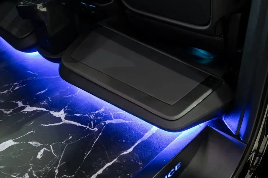 黑色岩板地面是内饰的点睛之笔,选用进口天然黑色岩板经过 12 道工序加工而成,表面光滑如镜,硬度达莫氏 7 级,比普通实木地板耐磨 10 倍以上。岩板表面带有自然的晶体纹理,在灯光下折射出低调的光泽,既耐脏防污,又方便清洁 —— 即使泼洒饮料或沾染泥沙,用湿布一擦即净,让车内始终保持整洁。