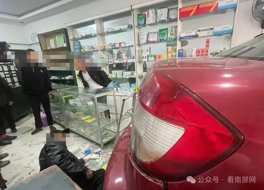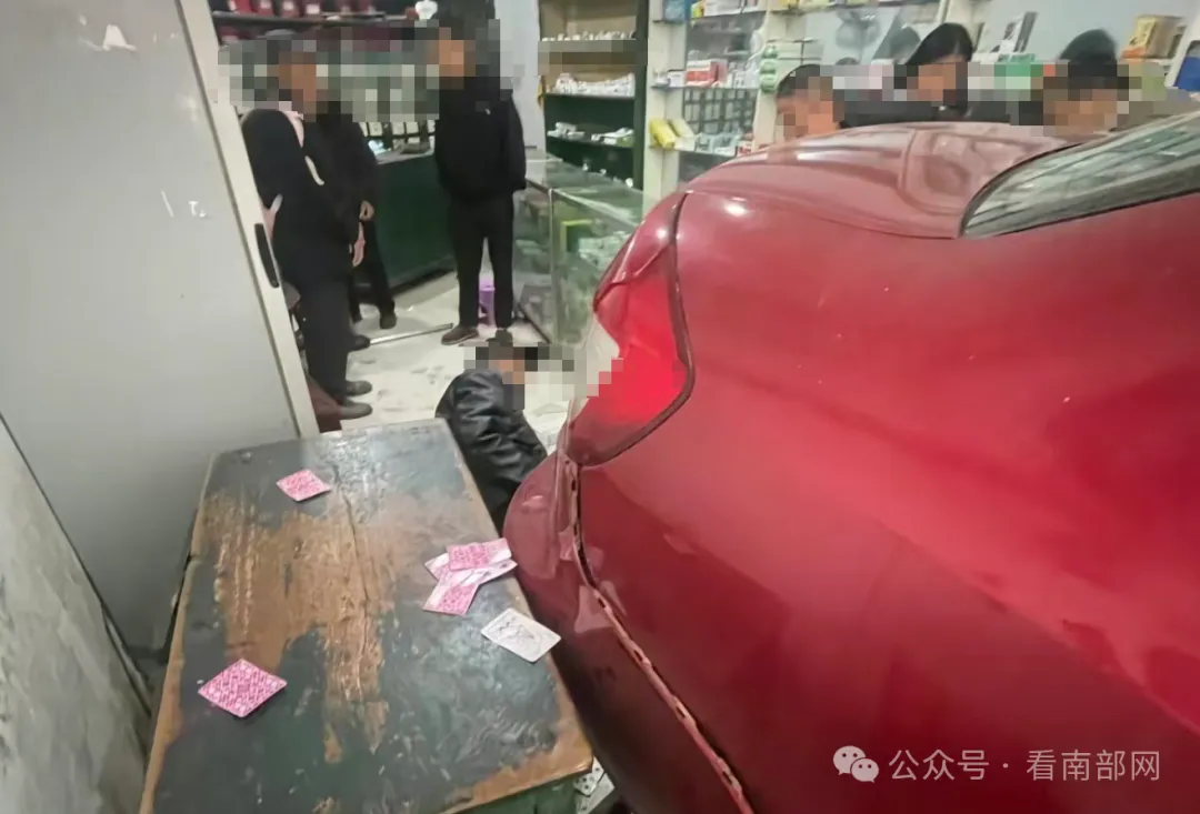 从现场图片可见,涉事红色轿车从诊所大门冲入,整个车身几乎完全进入室内,车头和车尾均有明显碰撞痕迹。诊所内一片狼藉,原本摆放整齐的药柜、玻璃柜台被撞得东倒西歪,各类药品散落一地,一张木质桌子被车辆尾部挤压变形,桌上的扑克牌散落各处。有人员在现场围观,一位老人坐在车辆旁的地面上,所幸暂无生命危险。