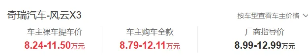 总的来说,这款风云X3的价格确实实惠,入门级也就是8万出头,中高配置车型也全部在10万元左右,所以说奇瑞将越野车的价格打得是越来越低了。