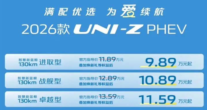 刚刚看完2026款UNI-Z PHEV的上市发布会,我直接愣住了。11.89-13.59万的官方指导价本身已经够狠,结果长安还来了个限时权益价9.89万起——没错,不到10万,就能把一台插电混动SUV开回家!