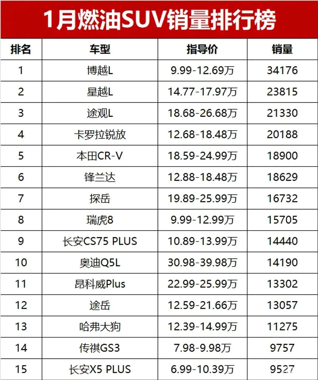 乘联会数据显示,1月共有13款燃油SUV销量破万,远超新能源SUV的6款,这足以说明家用消费者对燃油车的依赖度依旧很高。
