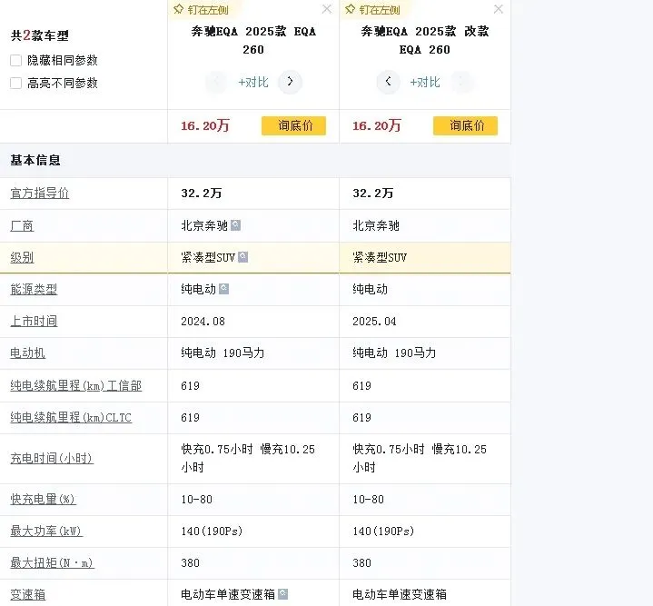 总的来说,这台车奔驰EQA的动力和配置相比同级别同价位下的国产车型,还是存在着一定的差距,不过因为有奔驰这个豪华品牌的加持,还是让它的官方指导价直接定到了32.2万。