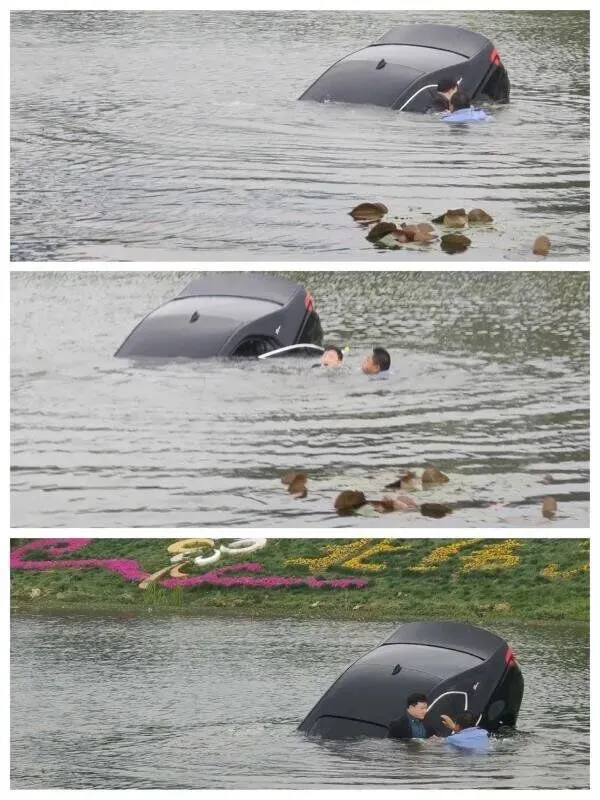 4月27日下午16时22分,一辆黑色轿车由于驾驶不慎落入牛角大圩1号岗对面水塘,岗亭值班人员发现后立即赶赴事发点,看到落水车辆迅速被淹没时,牛角大圩综管队员董光耀没有丝毫犹豫,便一头扎入水中对被困司机进行营救。
