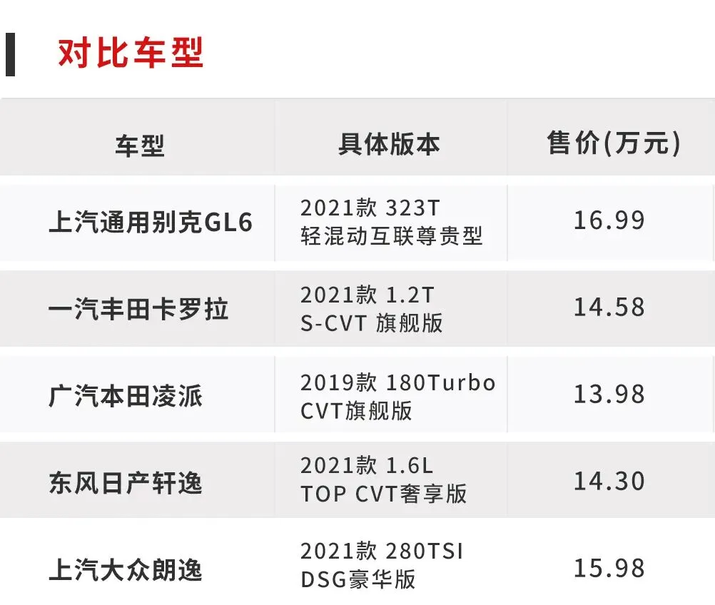 为了了解别克GL6是否真的能够应对不同场景下的家用需求,我们为别克GL6找来了一汽丰田卡罗拉、广汽本田凌派、东风日产轩逸、上汽大众朗逸4款车型进行对比,它们都是市场上最热门的紧凑型轿车,可以说是这个细分市场的佼佼者。